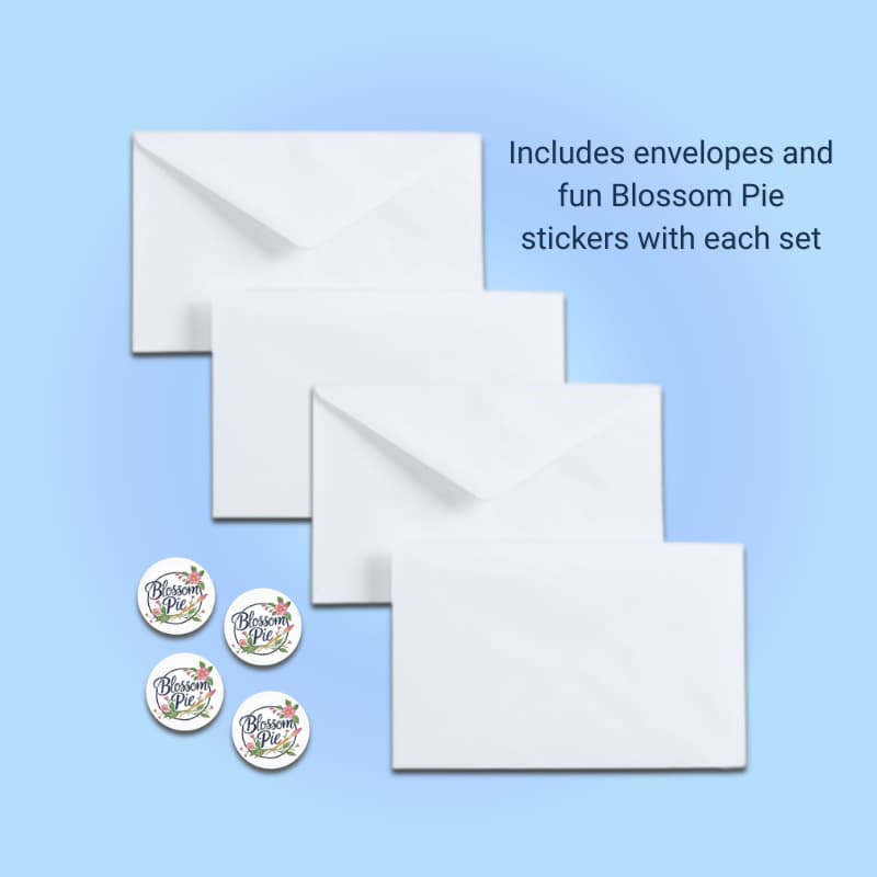- Complete Stationery Set: Includes four crisp white envelopes and four charming “Blossom Pie” stickers to seal your notes with an extra heartful touch.